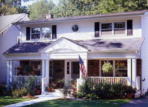 Left: A flagstone sidewalk leads to Jenny and Bob Kopach's new porch, which they consider to be an outdoor room. With its rich architectural detials and impressive stature, the center gable complements the home's Colonial styling.